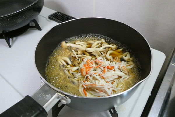 | 6. | 残った煮汁に、しめじとカニかまを入れてひと煮立ちさせ、水溶き片栗粉でとろみをつける。 |