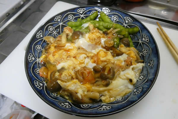 | 7. | そこに溶き玉子を流し入れ軽く鍋をゆすり、半熟程度に仕上げる。 |