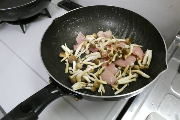 | 3. | フライパンを熱してバターをひき、ベーコン、しめじの順に炒める。 |