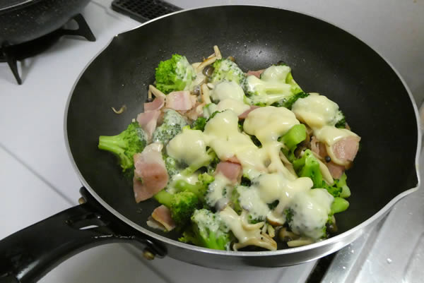 | 6. | とろけるチーズを適当な大きさに切り、ブロッコリーの上に乗せて、鍋蓋をする。 |