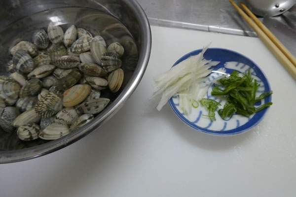 | 4. | 中鍋にあさりを入れ、あさりが口を開けたら、貝殻から身を取り出す。4、5個のあさりは、貝殻付きのままよけておく(最後に飾りとして乗せるため)。そして、長ネギの細切りを中鍋に入れる。 |