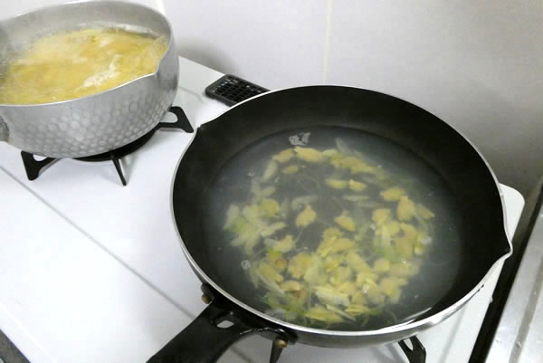 | 2. | 中くらいの鍋で湯を沸かし、スライスにんにくを入れ、料理酒とみりんを加え煮立たせ、輪切り唐辛子を入れ、塩少々を加える。 |