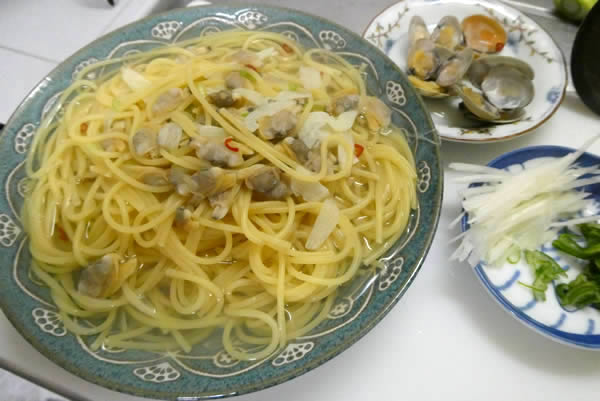 あさりのスパゲティーを「ボンゴレ」と言っていますが、「ボンゴレ」は「貝」という意味だそうです。「ボンゴレ・ビアンコ」と「ボンゴレ・ロッソ」があり、「ビアンコ」は白ワインの「白」、「ロッソ」は「赤」と言う意味で、「ボンゴレ・ロッソ」はトマトソースを使用しているパスタで、成程と納得。今回のあさりのスパゲティーは「ボンゴレ・ビアンコ」になるみたいです。白ワインは使いませんでしたが、料理酒で「白」だから、OK。