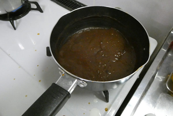 | 3. | 味噌ダレを作る。パン鍋で少しの湯を沸かし、顆粒の中華スープを溶かす。そこに生姜とにんにくのすりおろしを入れ、ひと煮立ちさせ、お酒とみりんを加えて煮つめる。次に八丁味噌を入れて、木べらで丁寧に溶かす。味噌をきれいに溶かしたら、水溶きの小麦粉でとろみをつける。 |