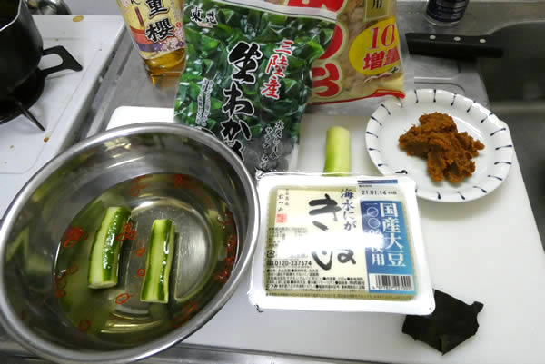 ここらで味噌汁の準備。具材は豆腐とわかめにします。長ネギ少々も入れることにします。横に写っているきうりはお新香用で、濃い塩と輪切り唐辛子に漬けてあります。5、6時間前に漬けておきました。お新香がないと定食として様になりません。