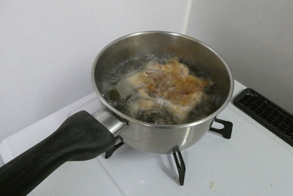いよいよ油で揚げます。揚げ油が古くて、新しく入れ替えたら、油が少なすぎて困りました。でも何とかイケそう。いつもよりこまめに表裏を返します、焦げ付かないように。
