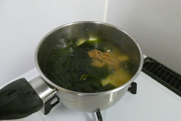 | 2. | 小鍋でだし汁(昆布・かつお節)を作り、豆腐と水で戻したわかめを入れ、沸騰したら味噌を入れて火を止め、そのままにしておく。 |