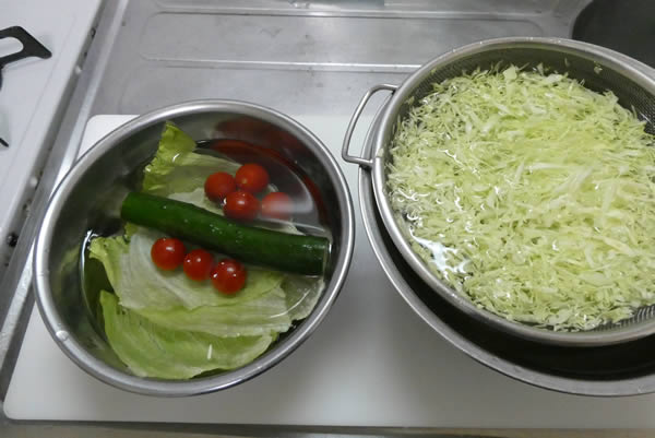 付け合わせの野菜を準備しなくては。キャベツの千切りを水にさらし、レタス・きうり・ミニトマトも水につけておきます。