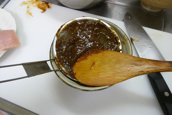 | 4. | 出来上がった味噌ダレを、味噌の固まりと小麦粉の固まりを除くため、網で濾す。 |