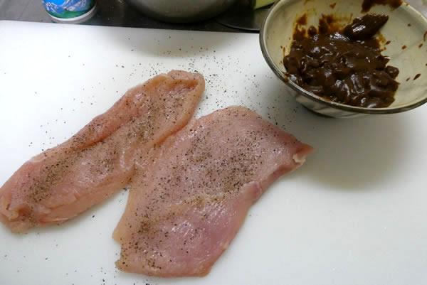 さてメインの鶏肉。むね肉にしました。ぶ厚かったので、二枚に添え切り。火が通りやすく食べやすいので、この方がいいでしょう。両面に塩・胡椒します。横に控えしは、美味しい味噌ダレ。