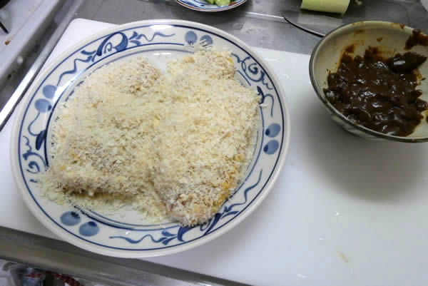 小麦粉・生卵・パン粉の順で鶏肉に衣を付けます。これでようやく下準備完了。ホッと一息です。