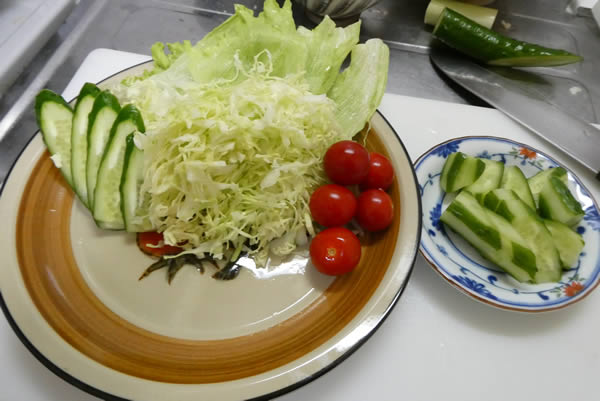 揚げている合間に、盛り付け皿に野菜の準備。お新香用のきうりも切っておきます。