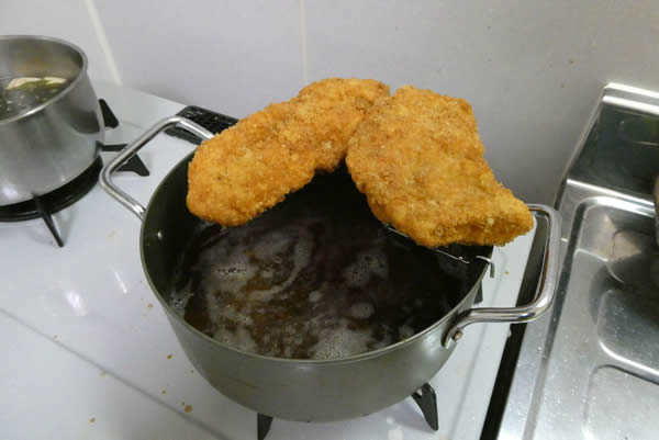 | 5. | 鶏むね肉は、塩、胡椒を振りかけ、小麦粉、生卵、パン粉の順に、衣を作る。 |
