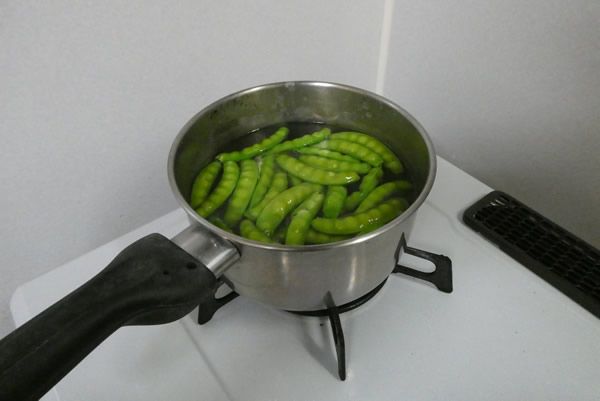 砂糖ざやは、沸騰したお湯でさっと茹でて、ザルで湯切りをしてボウルに移します。