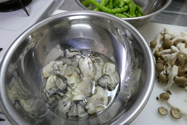 牡蠣も水洗いしてボウルに入れ、これで準備完了。あとは煮るだけのスタートライン。
