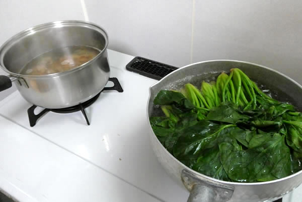 取り敢えず先にほうれん草を茹でることにします。左側の鍋には若竹煮用に出し汁を用意。