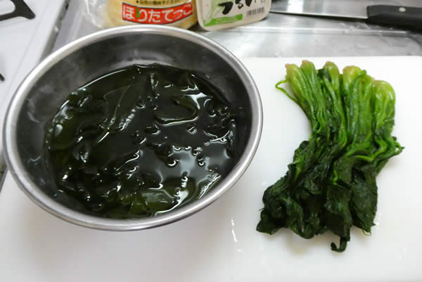 ほうれん草、ちょっと柔らか過ぎたかな。湯通しぐらいがシャキシャキして丁度いいのですが、まあ良しとしましょう。わかめは塩抜きして水につけておきます。