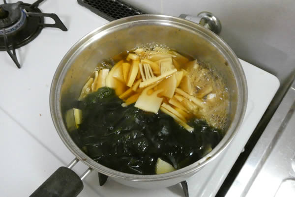 | 1. | 昆布とかつお節でダシをとり、若竹煮を作る。 |
