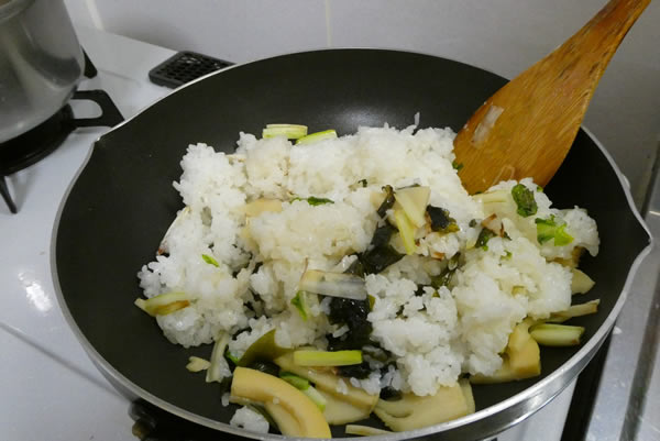 | 4. | 次にご飯を加え、炒めて、塩、胡椒で薄めに味付けをして、若竹煮の竹の子とわかめを加え、煮汁を少し入れる。 |