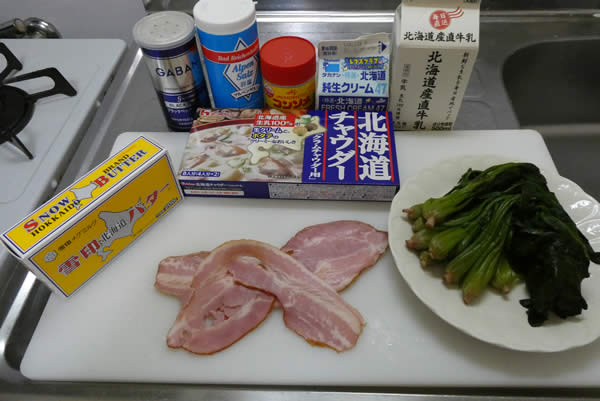 材料はこんな感じ。意外と簡単そう。今回のキモはホワイトソースですが、あまり凝らないで、市販の固形ルーを使用します。ちょっと気分が楽、というより、だいぶ気分が楽です。