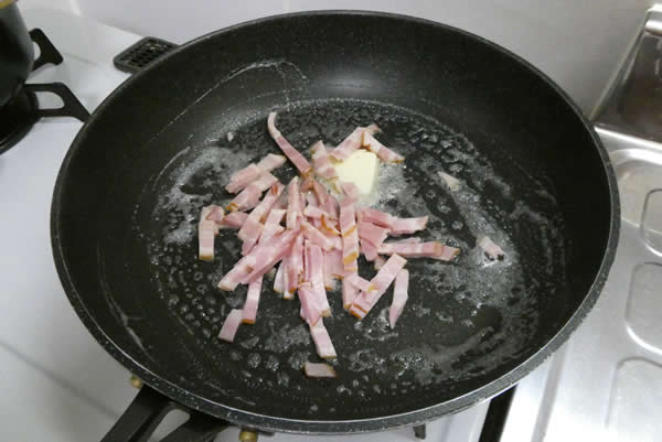 フライパンを熱して、バターを溶かし、ベーコンを炒めます。