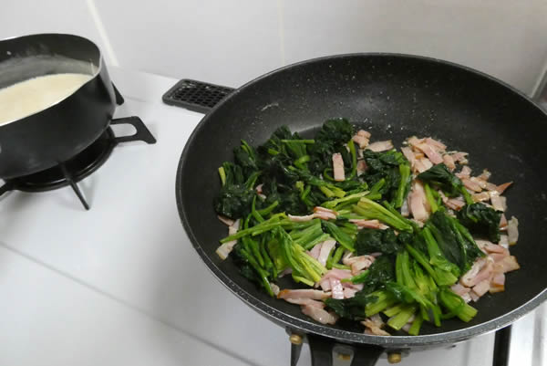 | 2. | ベーコンは好みの大きさに切り、フライパンでバターで炒める。そこに茹でたほうれん草を入れて、塩、胡椒で味付けをする。 |