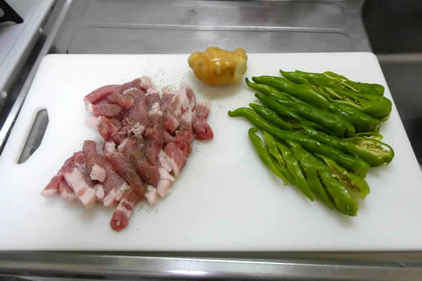 豚肉は角棒切りにして、塩・胡椒を振ります。ししとうはヘタをとり、いったん水にさらして斜めにザクザクと切ります。「甘とう」だから辛くないのかな... そんな訳ないでしょう、痩せても枯れてもししとうですよ。「万願寺とうがらし」は京都産で、「土佐の甘とう」と喧嘩するといけないので、次回にまわします。