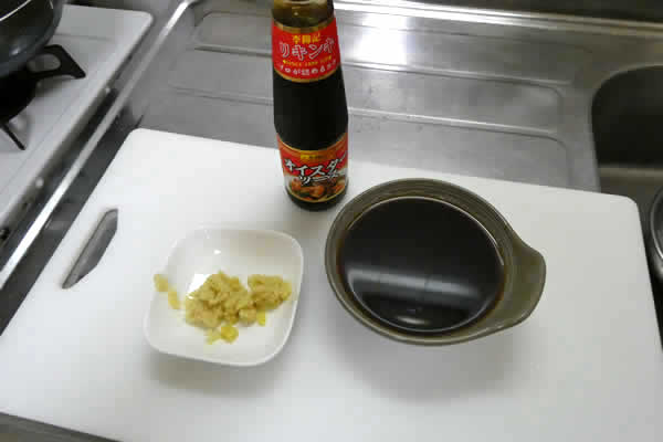 とりがらスープの顆粒をお湯で溶かして、お酒・みりん・濃口しょうゆでタレを準備します。生姜も入れておきます。そして今回のポイントはオイスターソース。黒っぽいタレが頭に浮かんでたので、オイスターソースを加えることにしました。 色よりも、コクのほうが大切かも。