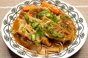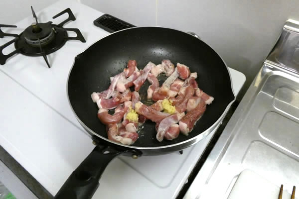 | 5. | フライパンに油を入れ、角棒豚肉を入れてサッと炒める。この時に生姜を少々入れる。 |