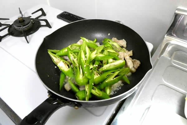 豚肉の表面に火が通ったら、ザク切りのししとうを加え、炒め続けます。