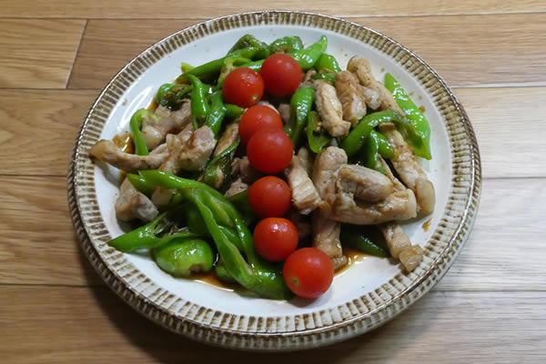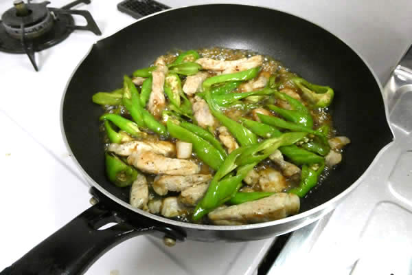 | 6. | 肉の表面に火が通ったら、ザク切りにしたししとうを加え、混ぜ合わせる。 |