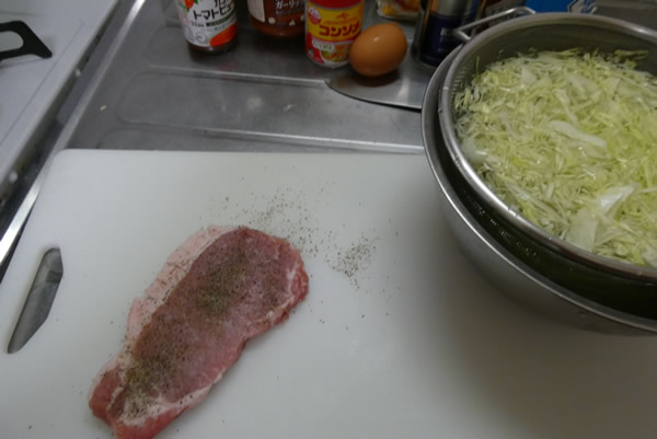まずキャベツを千切りにして水にさらしておきます。キャベツはシャキシャキが美味しいですから。そしてトンカツ用豚肉に塩・胡椒を振りかけて。