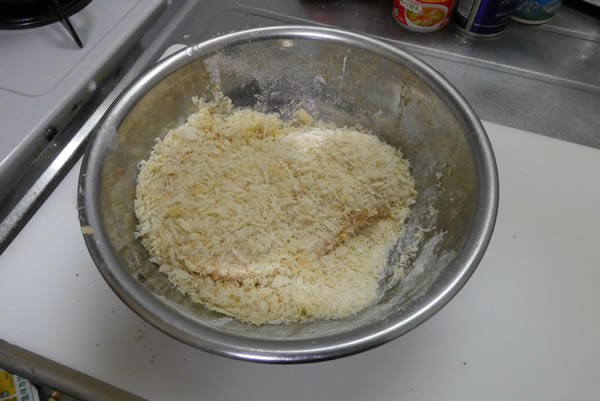 いつもの要領で、小麦粉・溶き卵・パン粉で衣を付けます。これで面倒な作業は終了。手にパン粉とかついたりするので、丁寧に手を洗って、ここから先は手が汚れません。