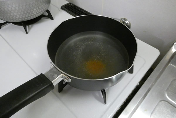 いよいよあんかけスープを作り始めます。まず最初に小鍋で湯を沸かして、顆粒コンソメを溶かします。分量は適当に、まあこんなもんでしょう。