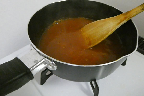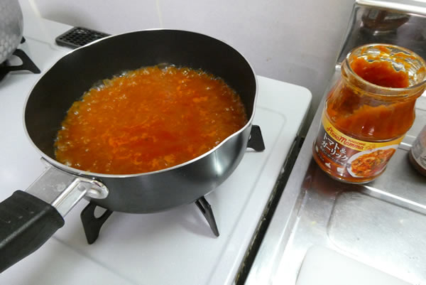 | 2. | 手鍋に湯を沸かし、顆粒コンソメを適量溶かす。次に、かごめのアンナマンナ(トマト&ガーリック)を目安分加え、トマトピューレも加え、煮立たせる。そしてタバスコを少々振り入れる。 |