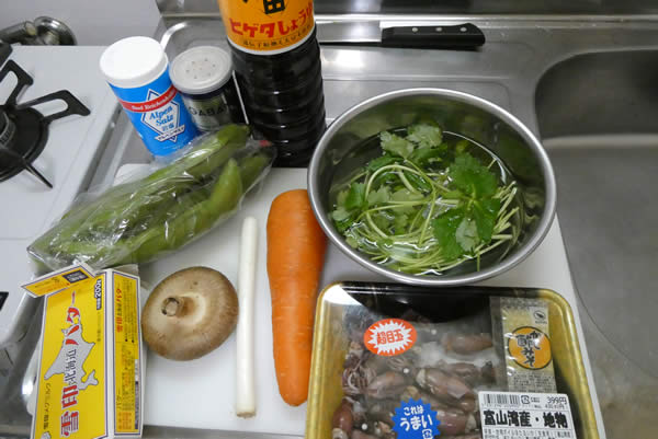 材料はこんな感じ。ホタルイカは季節もピークなので大振り、そして富山県産。期待が高まります。ホタルイカだけでは淋しいので、人参・椎茸・三つ葉・長ネギを入れることにしました。ちょっと濃い口当たりになりそうなので、そら豆を添えてみることに。