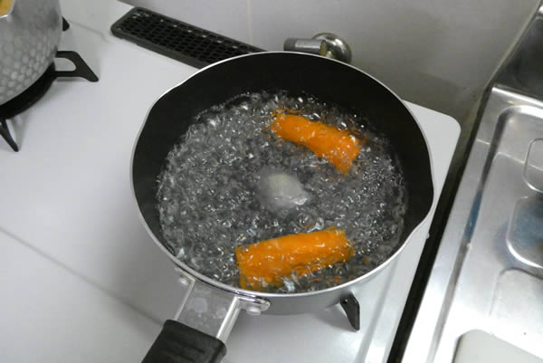 人参は硬いと食べた時に気になるので、下茹でして、ある程度柔らかくしておきます。