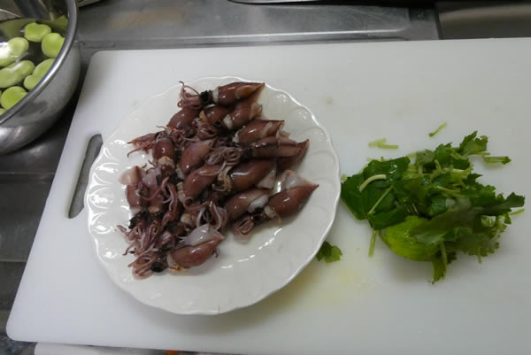 | 8. | 最後にバター炒めしておいたホタルイカを入れて軽く混ぜて出来上がり。横に茹で上がったそら豆を添える。 |