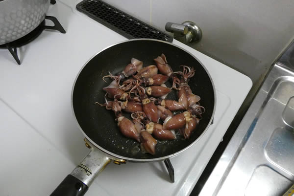 | 3. | ホタルイカは目の部分を手で取り除き、5個ほどを細かく切り、残りはバターで炒め、醤油をサッとかける。 |