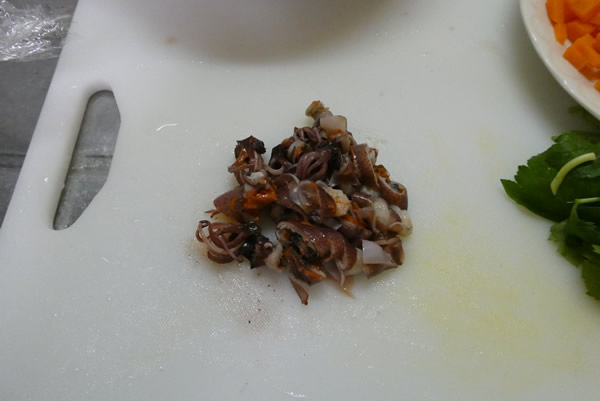 炒める前に除けてあった5個ほどのホタルイカを細かく切ります。これはご飯にホタルイカの下味をつけるためのもので、これが味の決め手となる予定。