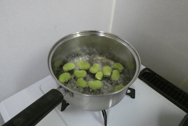 そら豆を茹で始めます。茹で上がる頃には、炒めご飯が完成しているでしょう。先に茹でておくとシワシワになるので、タイミングを見計らってのことです。