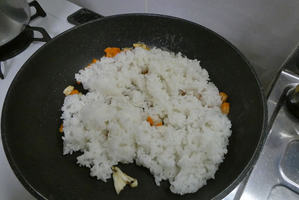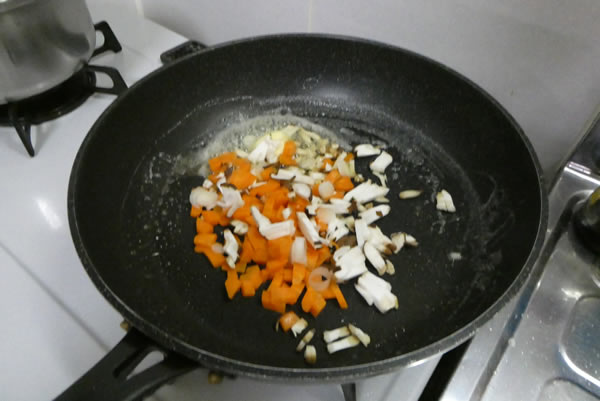 | 5. | 熱したフライパンにバターを入れ、準備してあった人参・椎茸を炒め、ご飯を加えてさらに炒め、塩・胡椒で味付けする。 |
