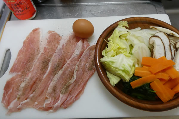 野菜を適当な大きさに切ってお皿に乗せて準備しておきます。豚肉はきちんと広げて塩・胡椒します。おっと、卵を忘れていました。卵は最後に鉄板に流し込む、重要なアイテムです。