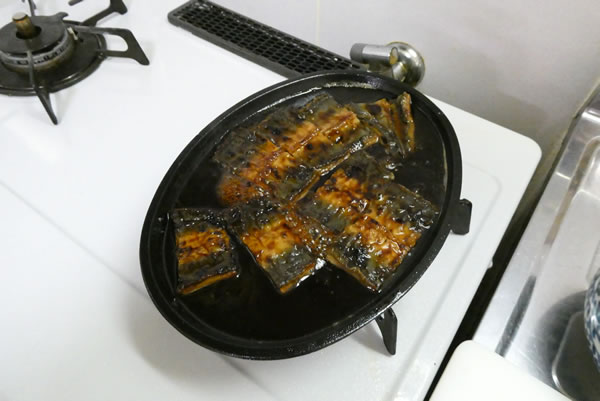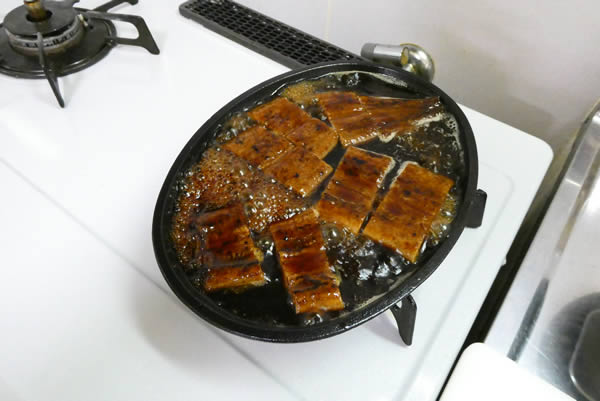 | 4. | タレが沸騰したら、上にうなぎを乗せて温め、裏返して同じく温める。 |