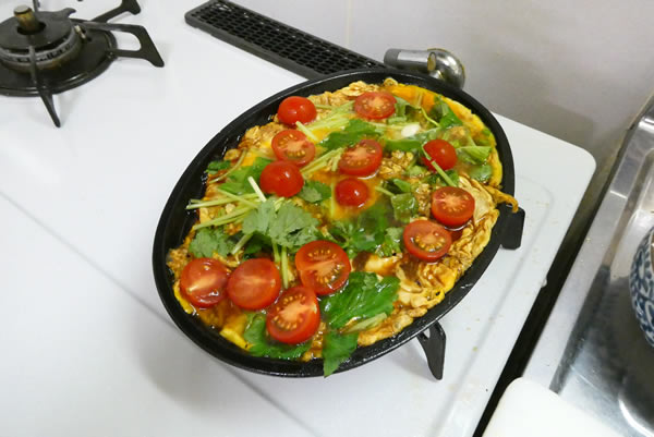 卵が半熟のままで、プチトマトと三つ葉を散らします。そして、うなぎを鉄板の上に戻します。