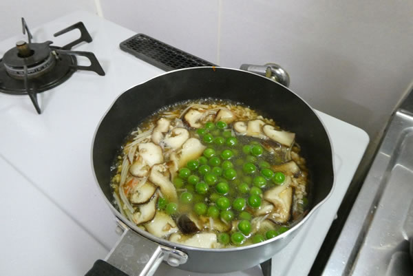 いい感じになったら、薄切りした椎茸・グリーンピース・ほぐしたカニかまをを入れて煮詰めます。