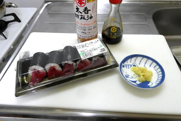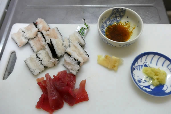 | 1. | マグロの巻き寿司をパックから取り出して、マグロと海苔巻きを手でより分ける。おろし生姜を準備しておく。 |