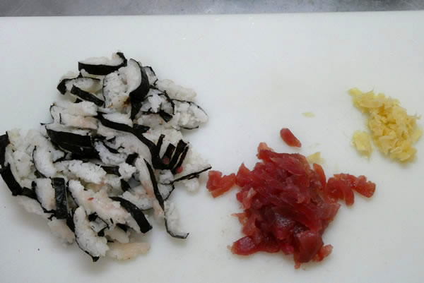 マグロを細かく切り、分けた海苔巻きも細かく切ります。そして、ガリもみじん切り程度に切っておきます。