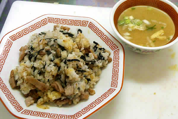 フライパンの炒めご飯の上からわさび醤油をサッとかけ、軽く混ぜ合わせて出来上がりです。チャーハン用のお皿に盛り付けてみました。味噌汁はカップの味噌汁でちょっと手抜き。