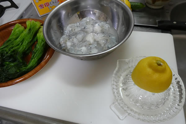 背ワタを取り除いたエビを薄い食塩水につけておいて、次は自家製マヨネーズの準備です。酢の代わりにレモン汁もよいとかで試してみます。